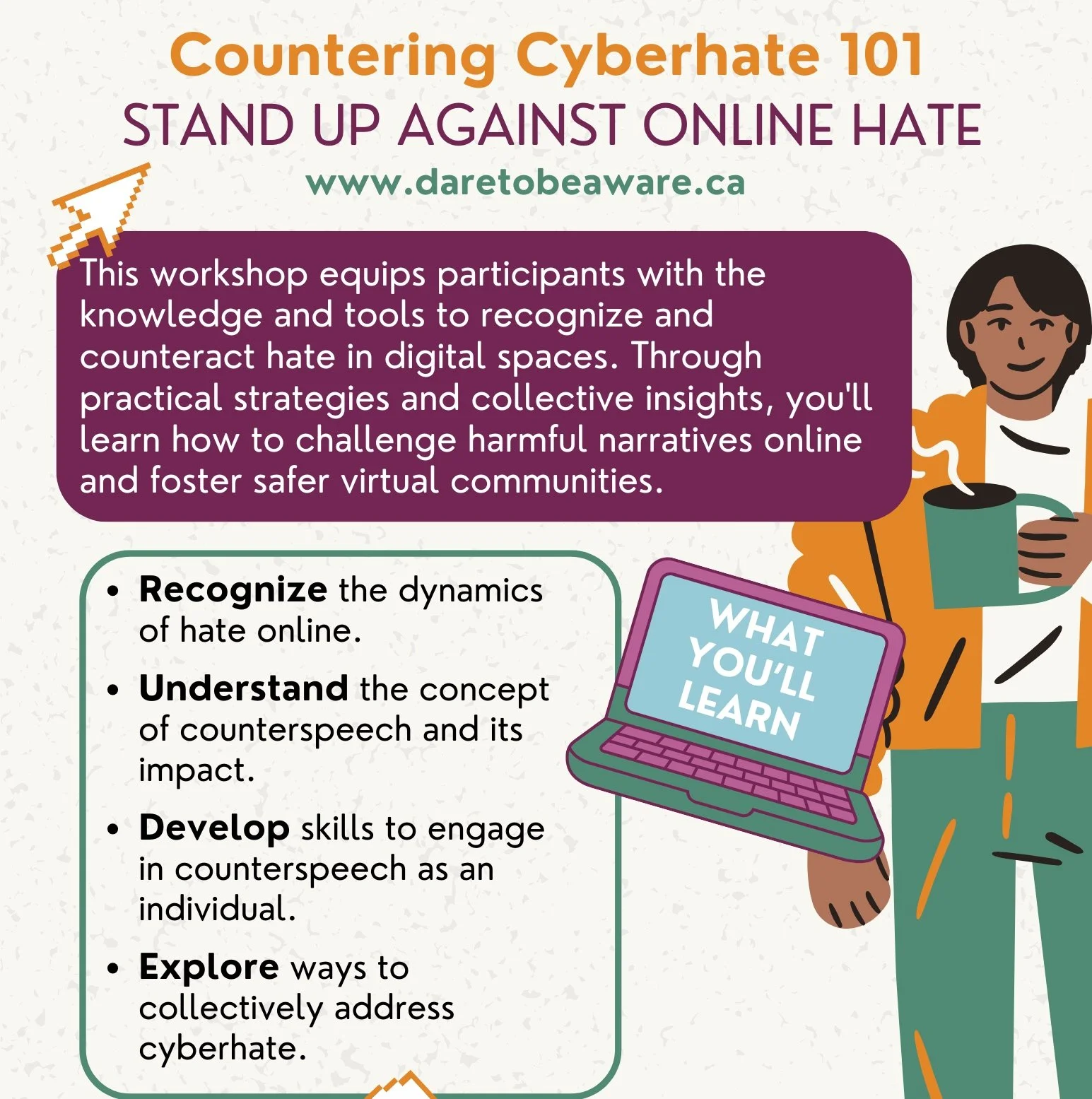 The Countering Cyberhate 1O1 Virtual Workshop aims to empower racialized women and girls to better understand online hate speech and extremism, including counterspeech and counter-narrative. With the incorporation of real-life examples, alongside live discussions on effective strategies to counter online hate, participants will have an increased capacity to recognize online hate and build the required skills and resources to counter cyberhate speech and narratives effectively.
